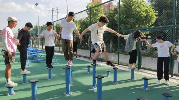 活动开始,宋正凯老师对心理素质拓展基地进行了简要介绍,强调了安全使用活动器材的注意事项,提醒同学们要严格遵守安全规程、听从指挥,在轻松愉悦略带紧张的氛围下顺利完成挑战项目。随后,项目负责人对素质拓展项目进行了逐一介绍,明确了项目任务目标和规则,并进行了现场演示。同学们在项目负责人的指导监督下,先后完成了“梅花桩”、“礼让通行”、“盲目障碍”、“智慧闯关”、“模拟电网”等挑战项目。其中,“梅花桩”“模拟电网”活动要求大家团结协作,共同完成挑战;“礼让同行”“盲目障碍”活动考验同学们两两之间的默契,“智慧闯关”则锻炼了大家的心理和身体素质。活动结束后,宋老师对同学们的表现和完成情况进行了点评,引导同学们回味活动开展中的情感体验,并鼓励同学们交流了自己的感受和收获。