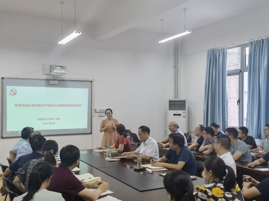 马铮老师做了题为《改革开放以来中国共产党依法治国思想的发展历程》报告。她的报告以时间为轴线,讲述了1978-1997法制创建新时期到1997-2012中国共产党依法治国思想的新阶段党推进依法治国到2012年十八大以来中国共产党依法治国思想新时代的发展历程,介绍了中国特色社会主义法治体系的内容和特点。阐述了我国全面依法治国总体目标和坚持中国特色社会主义法治道路的重要意义。马峥老师通过逻辑严谨的讲解帮助到场人员廓清了“从法制到法治?”、“从法制十六字方针到法治新十六字方针?”、“从依法治国到依法治国到全面依法治国?”等几个重要问题,马铮老师的逻辑严密、讲解幽默,大家听讲认真,现场气氛热烈。