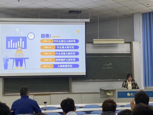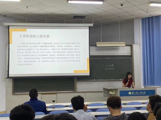 班会分三个阶段进行。首先,宋正凯介绍了召开本次主题班会的目的和意义。其次,杨莹娜、张璐瑶、江志勇三位同学先后做了汇报。杨莹娜带领同学们共同学习了人际关系的定义、内涵、分类、影响因素等重要概念,总结了多数同学们在建立良好人际关系过程中遇到的常见问题,针对问题给出了实用的解决方法,提出了构建良好人际关系所需要提升的能力,例如学会倾听、诚以待人等;张璐瑶以一组对比数据说明人际交往的重要性,阐释了人际交往的概念、类型和影响人际关系好坏的决定因素,解释了人际交往中常见的几种心理效应;江志勇重点阐述了人际关系的特点和分类。三人所讲,虽主题相同但侧重点却各有不同,相互补充相互印证,让同学们对人际关系的认识和理解更加全面和深刻。最后,宋正凯对他们的汇报进行了总结,并强调要重视建立良好的人际关系。