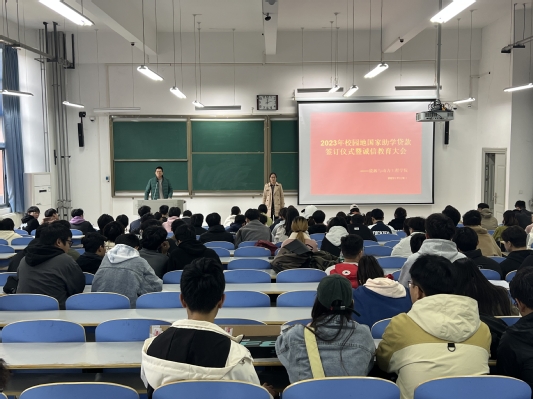 为更好地落实国家高校学生资助政策,确保每一位申请国家助学贷款的学生能够顺利获得贷款,11月9日中午,新葡京国际 在工程楼109举行了2023年度校园地国家助学贷款签订仪式暨诚信教育大会。新葡京国际 负责资助工作的宋正凯老师、研究生辅导员王霄老师以全体贷款研究生会、本科生参加了签订仪式