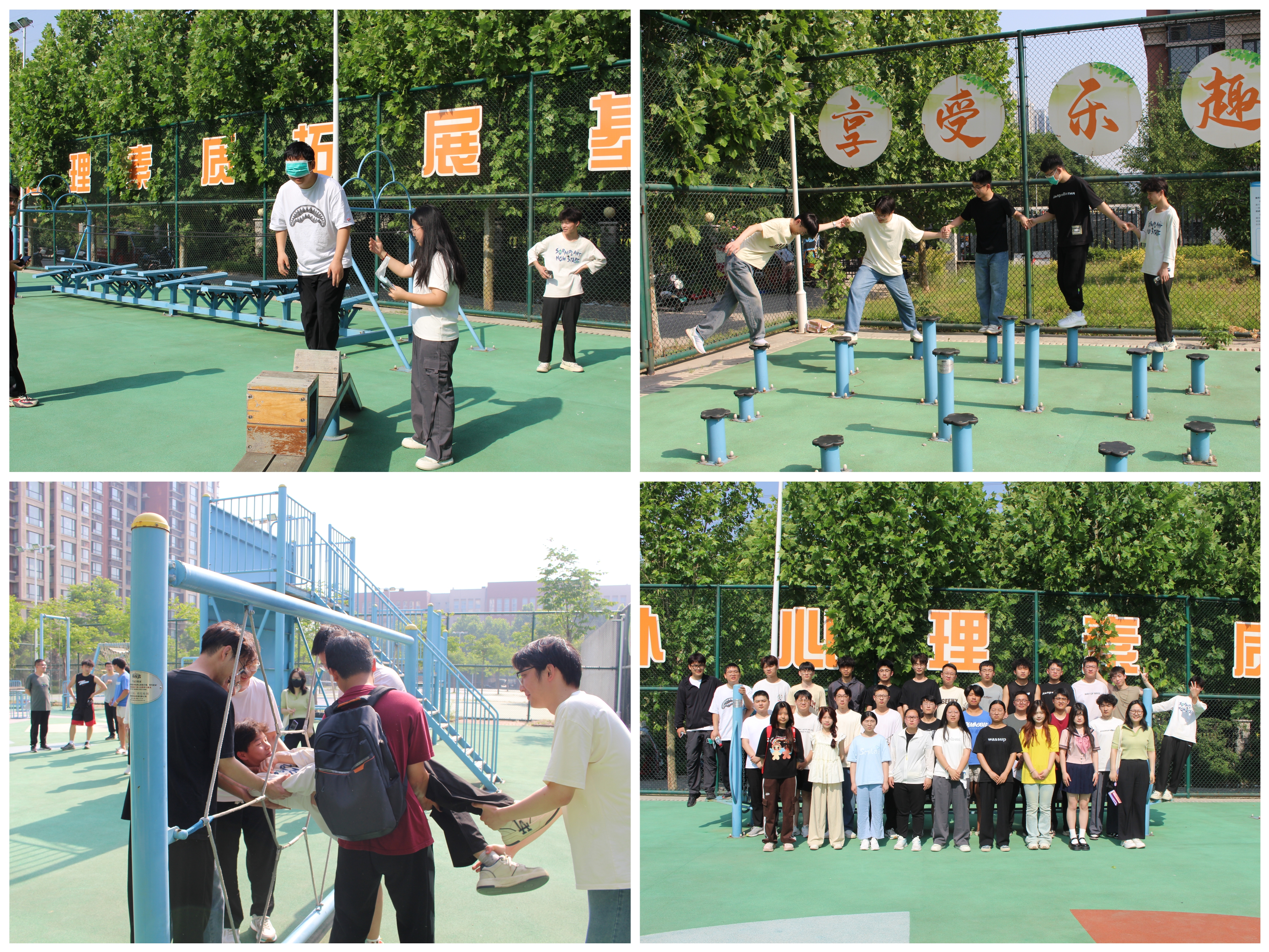 活动包含“模拟电网”、“携手并进”、“信任背摔”、“盲目障碍”、“梅花桩”、“智慧闯关”等多项挑战项目。其中“模拟电网”、“梅花桩”项目旨在培养同学们默契配合、团结协作的能力;“携手并进”、“智慧闯关”项目让同学们放下焦虑,体验运动的乐趣;“信任背摔”、“盲目障碍”项目培养同学们信任关系,克服心理恐惧。活动现场一片欢声笑语,同学们热情高涨,积极参与,共同配合,展现了青春的激情与活力。