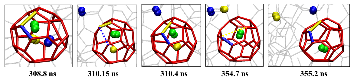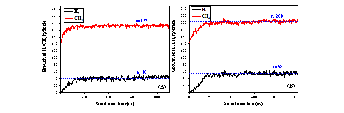水合物储氢技术是一种新型储氢技术,具有安全环保、可逆性好等优势。本文针对水合物储氢速率慢密度低的科学问题,采用甲烷作为水合物储氢的促进剂客体分子,通过分子动力学模拟方法研究了H2-CH4二元水合物生长特性,探索了不同甲烷浓度下H2-CH4水合物生长的分子机制,分析了浓度对动力学性质如水合物生长速率、水合物储氢密度以及笼形占据和结构转变等相关性质的影响。研究表明,在水合物生长过程中甲烷具有加速剂和稳定剂的双重作用,能够实现了较高氢气储存效率和较快的水合物生长速率。本研究成果旨在为水合物技术利用领域的研究提供理论指导,对水合物储氢技术的发展有一定的推动意义。