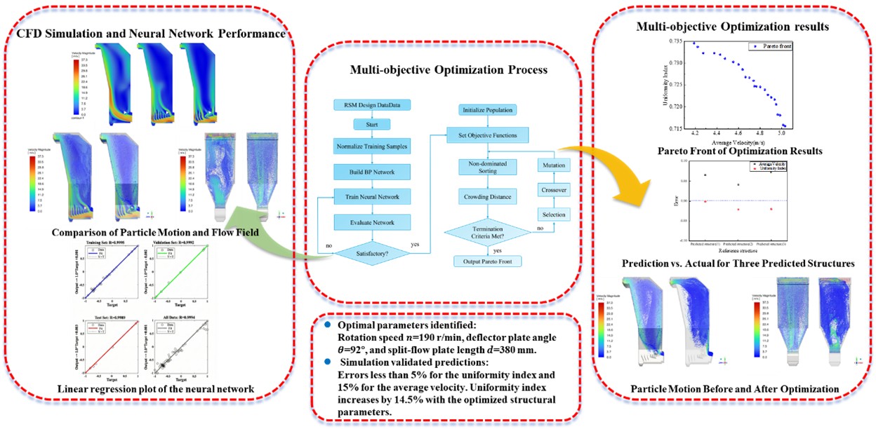 气流干燥因具有传热传质效率高、干燥速度快等优点,在烟丝加工等工业场景中应用广泛。但在实际运行过程中,设备内部容易出现流场分布不均、颗粒团聚、局部过干以及出口含水率波动等问题,进而影响物料干燥质量。针对上述问题,吴学红教授以SH23A气流烘丝机为研究对象,构建了气固流动与传热传质数值模型,在此基础上提出新型分流式导流结构,并结合BP神经络与NSGA-II算法开展多目标优化研究。研究结果表明,所建立的模型能够较好反映烟丝干燥过程中的含水率和温度变化,气流烘丝机出口颗粒平均含水率模拟值为12.92%,与实测值13.28%的相对误差仅为2.7%。与原始弧形导流板相比,优化后的分流式导流结构可有效改善设备内部流场分布,减弱局部低速区和颗粒团聚现象,使平均气流速度提高4.0%,均匀性指数提高11.8%。研究进一步得到较优参数组合,即均料棍转速190 r/min、导流板角度92°、分流板长度380 mm,且模型预测误差小于5%,表现出较高的预测精度与实际应用价值。