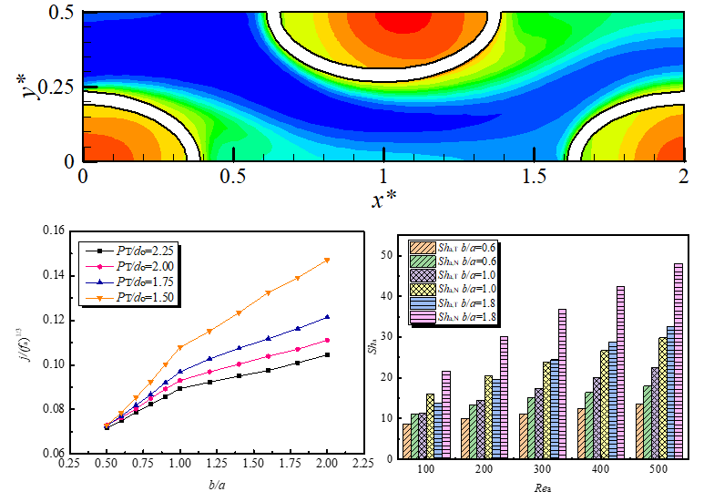 中空纤维膜组件是膜蒸馏海水淡化中有效的热湿交换器。为研究纤维管加工过程中等周长椭圆变形和错流结构中低雷诺数湍流现象,本研究建立了低雷诺数k-ε湍流模型。研究了空气雷诺数、椭圆纤维半轴比等对膜组件内溶液和空气的流场、湍动能场、温度场以及浓度场的影响。结果表明,管束空气流场对温度场和浓度场有显著影响,空气与溶液之间的跨膜热传递显著强于跨膜水分传递。该研究对比了热质耦合边界条件和传统等壁温边界条件下传热传质准则数计算结果,发现热质耦合边界能显著提高椭圆中空纤维膜组件内湍流传质性能的预测精度。通过增大纤维管截面椭圆半轴比并减小纤维管间距,有效提高了膜组件热质传递综合性能。这些研究结果对组件的设计和优化具有重要的指导意义。